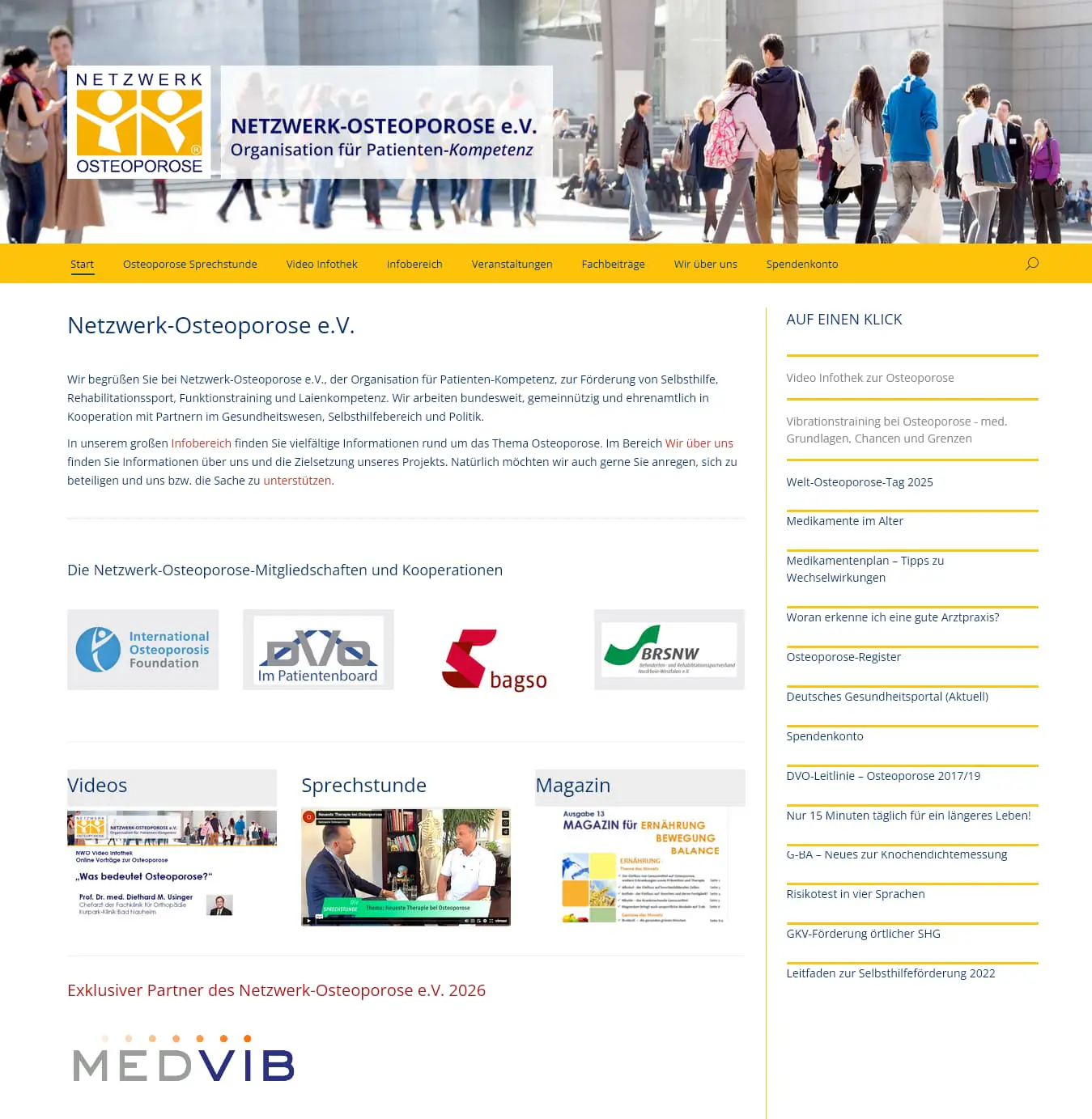 Das Netzwerk-Osteoporose e.V. ist eine bundesweit aktive Selbsthilfeorganisation, die sich auf die Bedürfnisse von Menschen mit Osteoporose spezialisiert hat. Ziel ist es, Patientenkompetenz zu stärken, Wissen zu vermitteln und Betroffenen Wege aufzuzeigen, wie sie ihre Lebensqualität nachhaltig verbessern können.